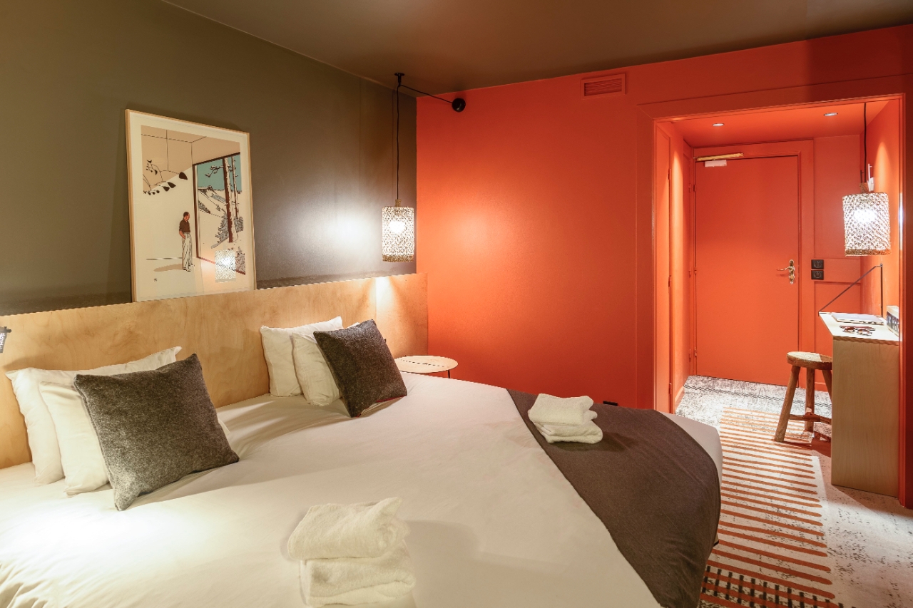 Access for 2 : Look out through the window of your colourful and functional bedroom, welcome to Chamonix-Mont-Blanc. (2 pax, 18m2, 1 double kingsize bed or 2 single beds)