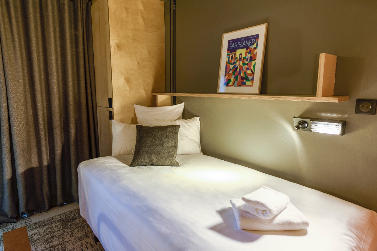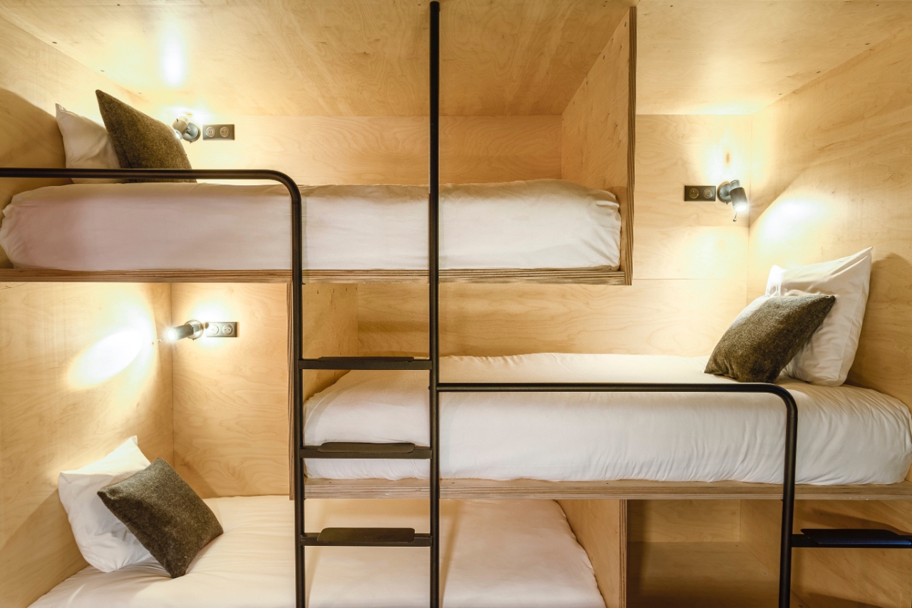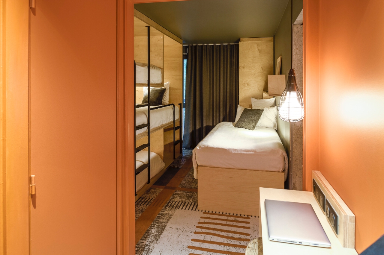 Access for 6 : Travelling as a family or with friends, the budget bedrooms for 6 are the perfect place for fun in a double bed room connecting to a dormitory room composed of a bunk bed on 3 levels and a single bed on the side - 2 bathroom. (6 pax, 36m2, 3 bunk beds + 1 single + 1 kingsize bed / 3 bunk beds + 3 single)
